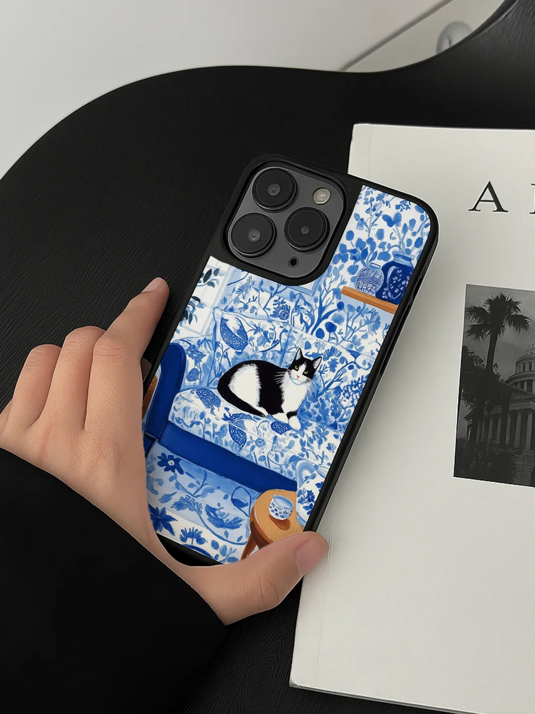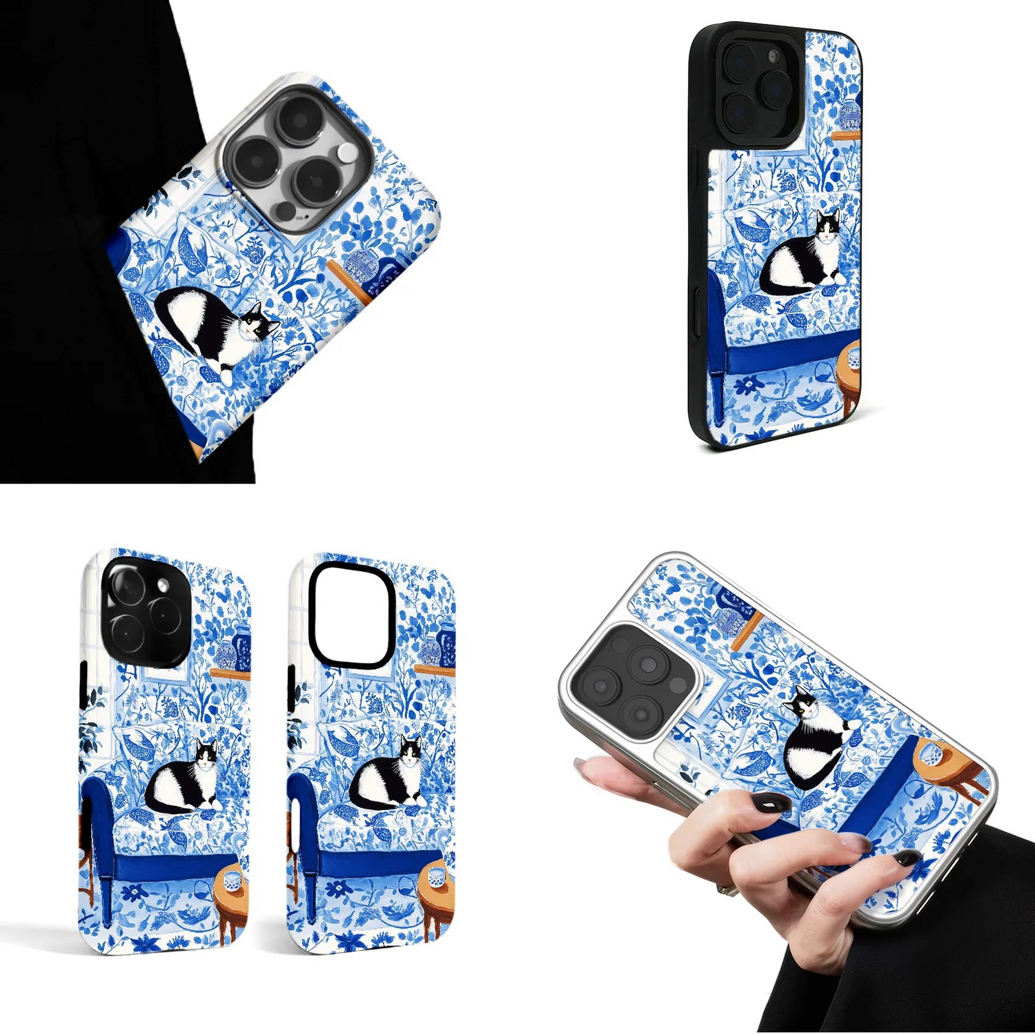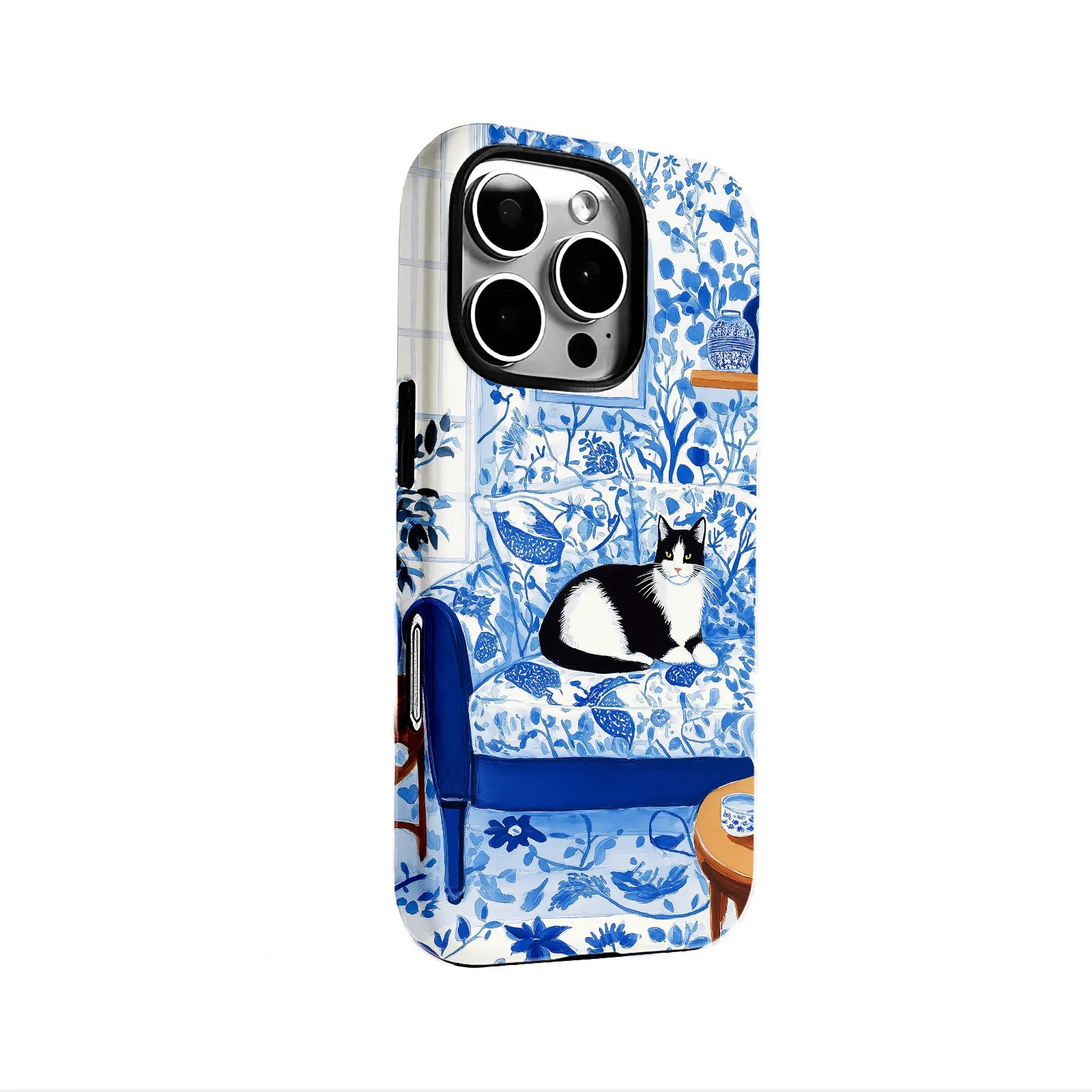 - This phone case features a black-and-white cat resting on a blue floral sofa, surrounded by cozy porcelain elements in a calm indoor setting.