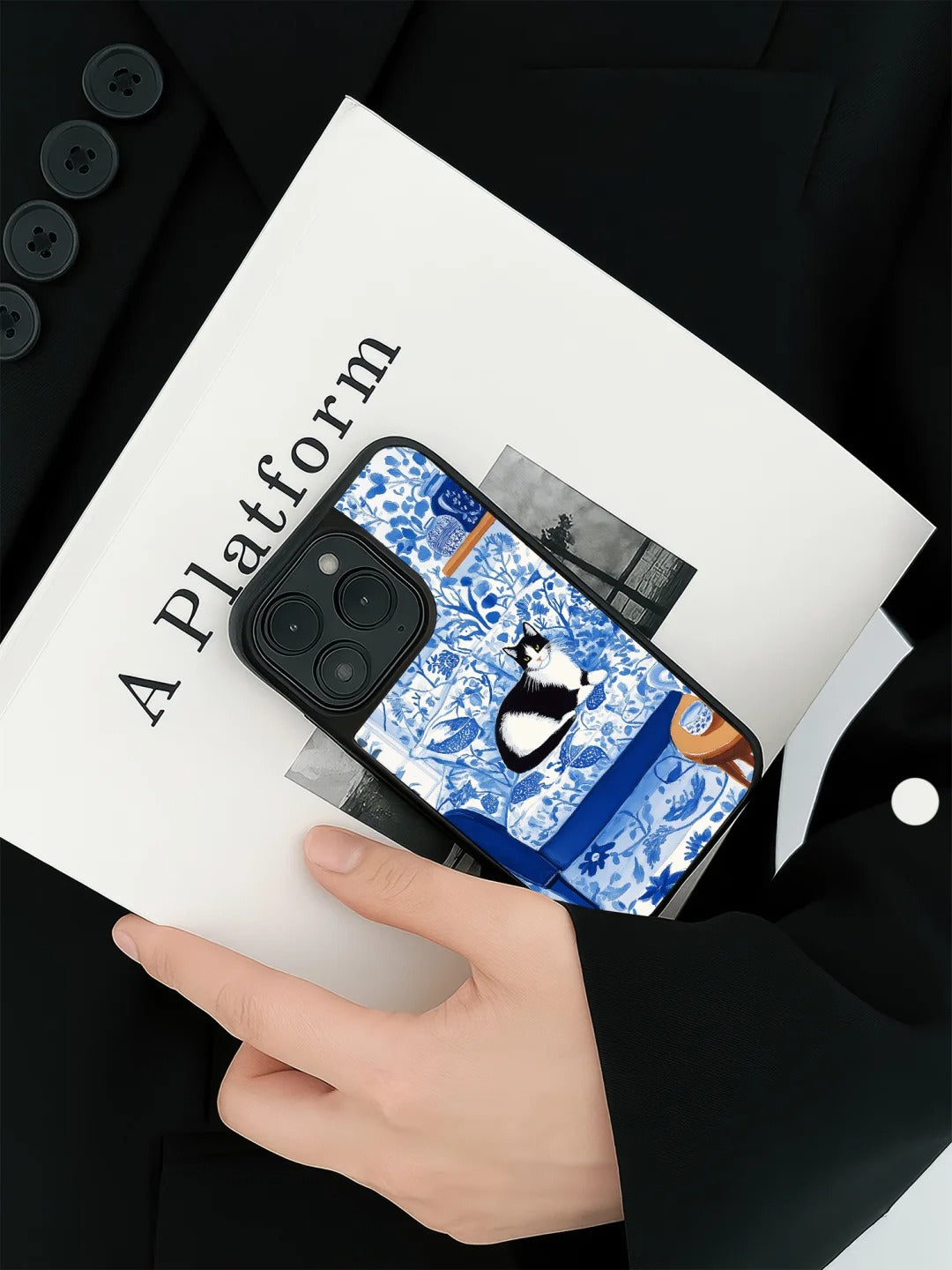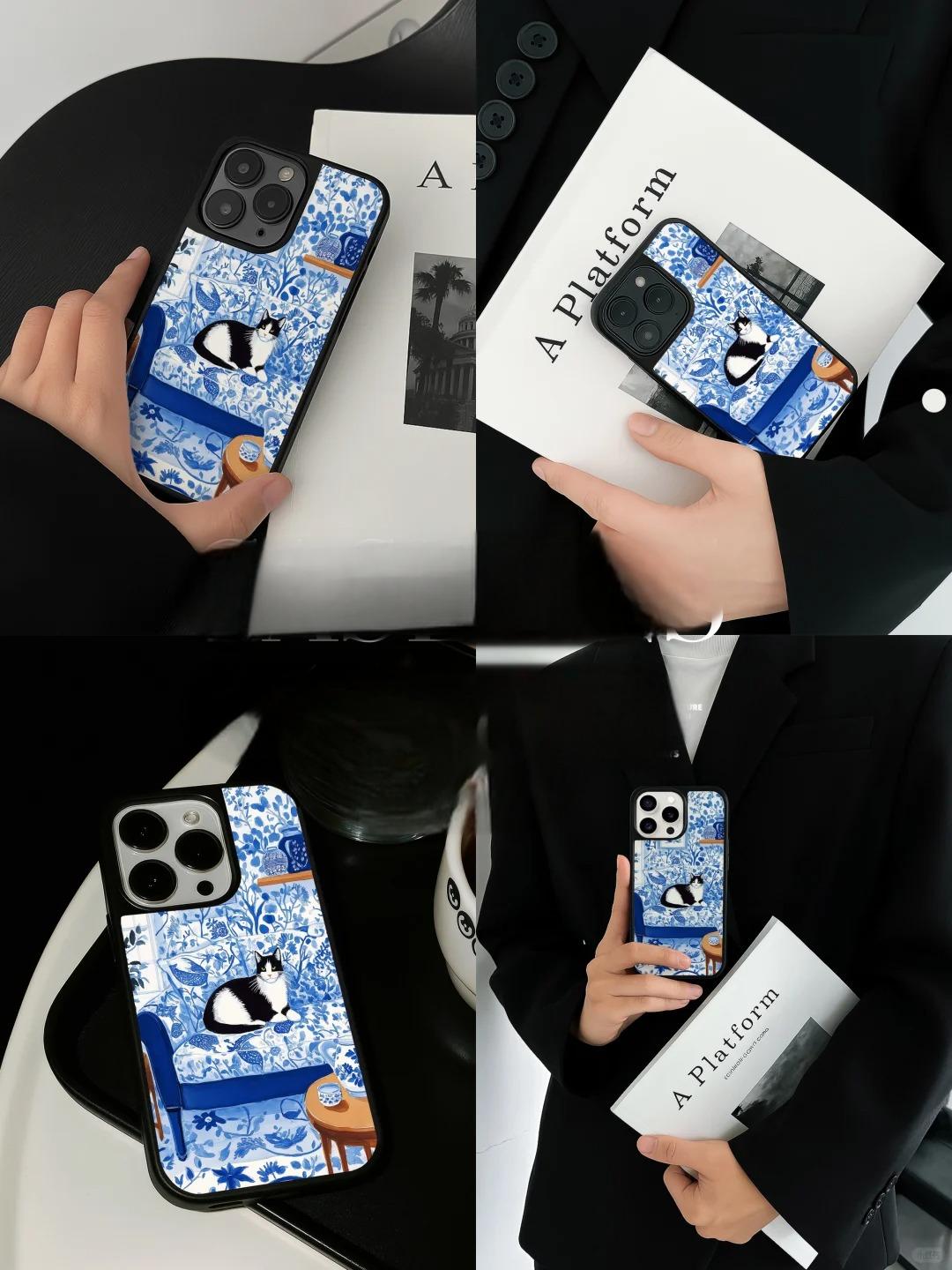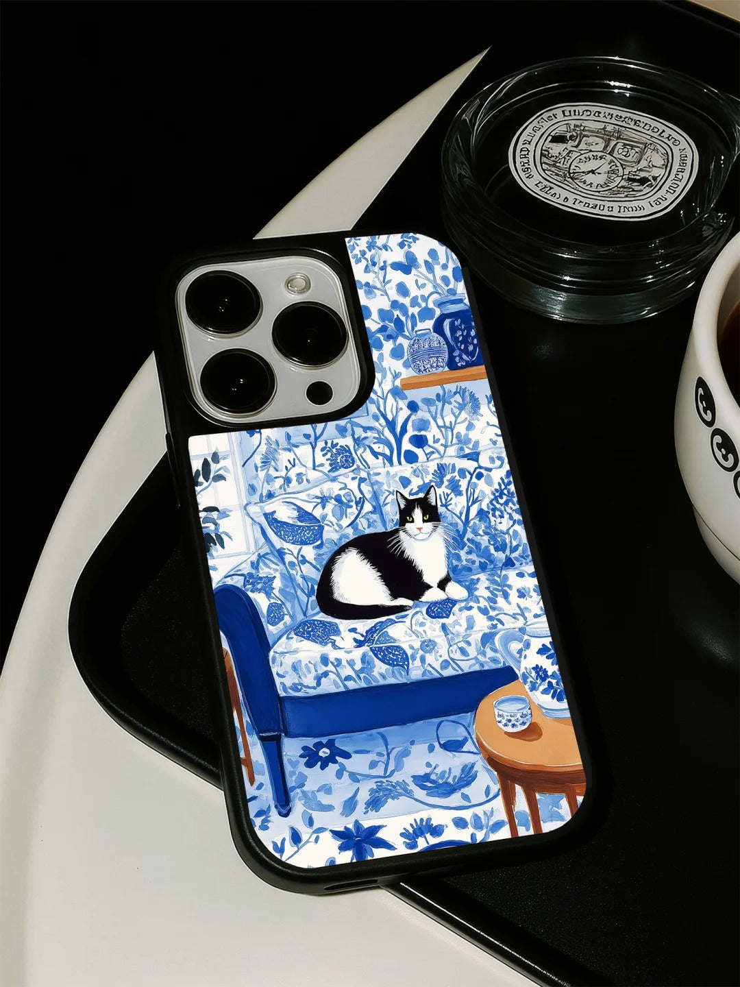 - This phone case features a black-and-white cat resting on a blue floral sofa, surrounded by cozy porcelain elements in a calm indoor setting.