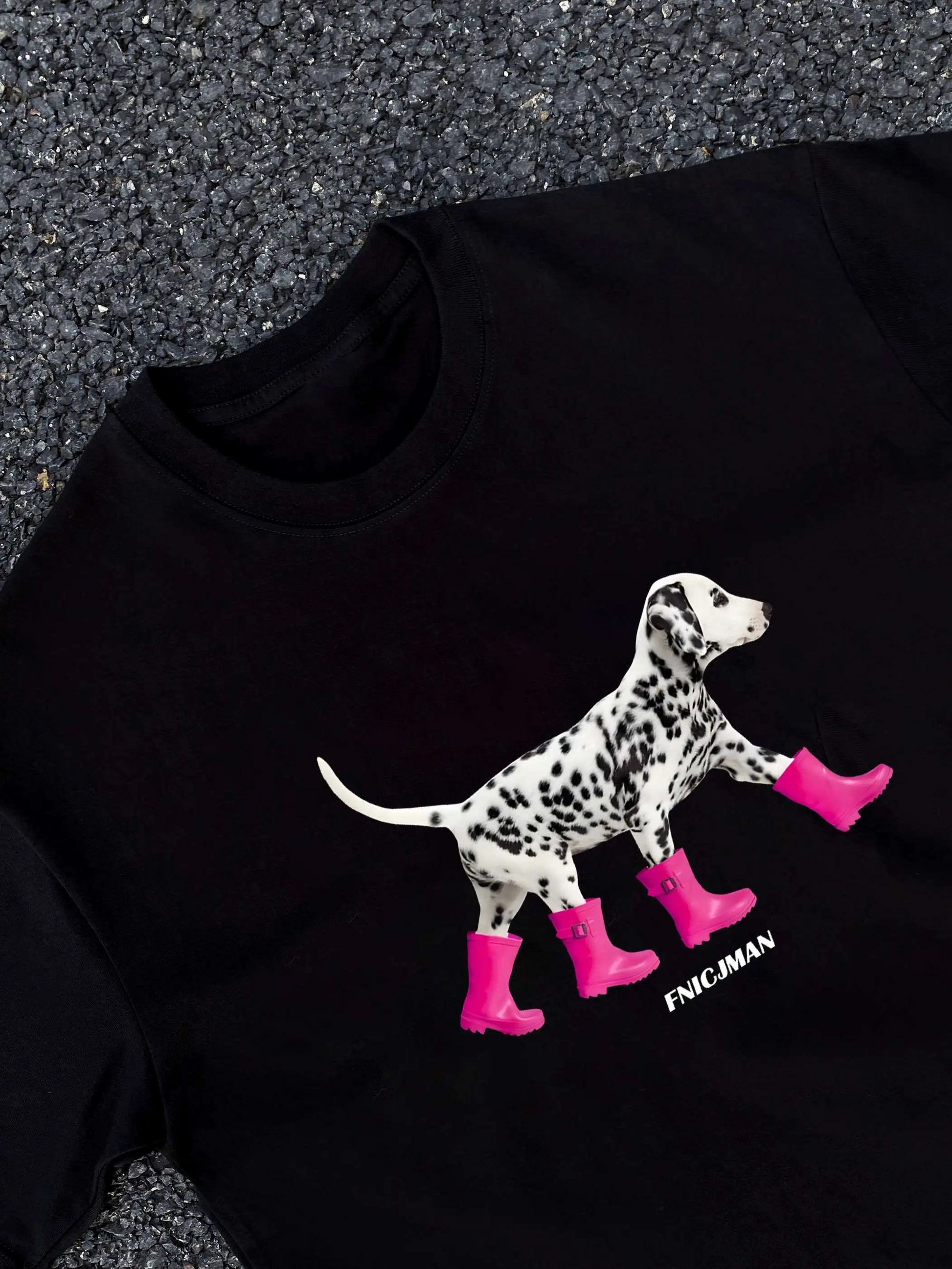 - This bold tee features a charming Dalmatian in vibrant boots—perfect for animal lovers with style.