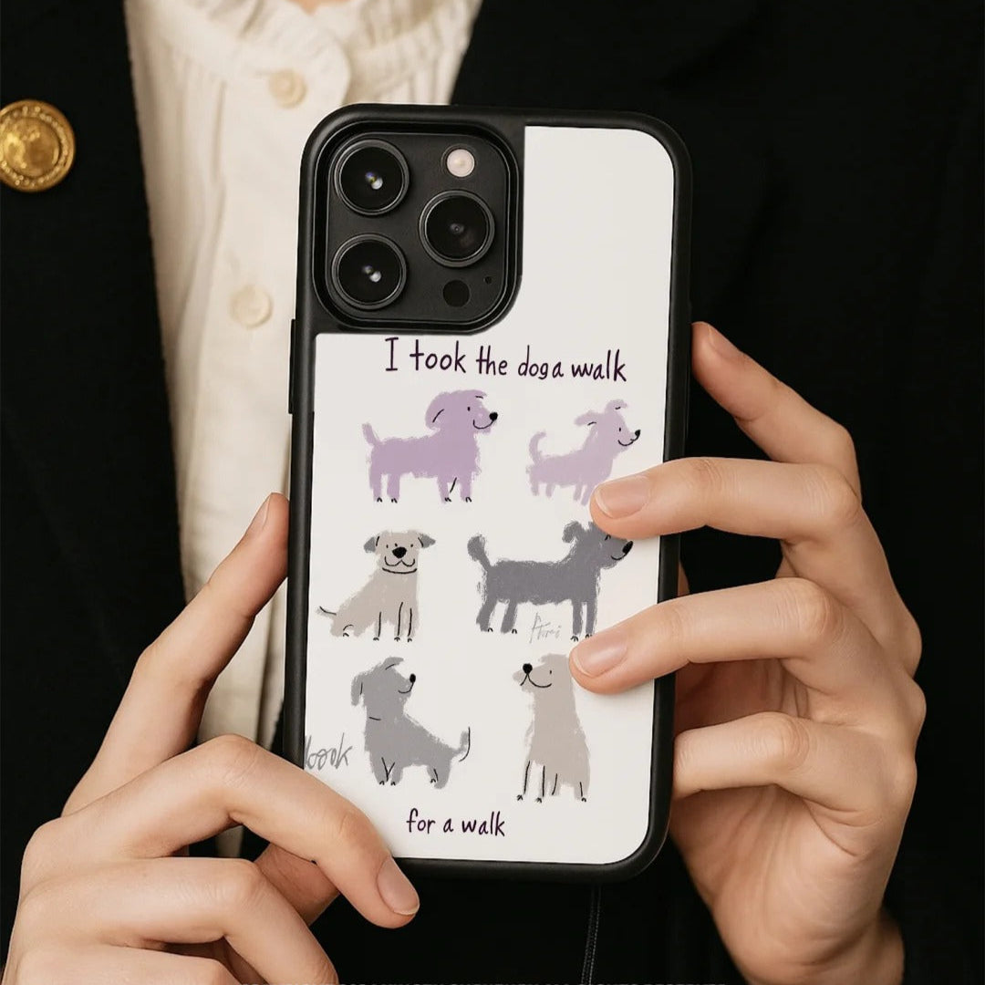 - A lively lineup of quirky, hand-drawn dogs in muted purples and greys.