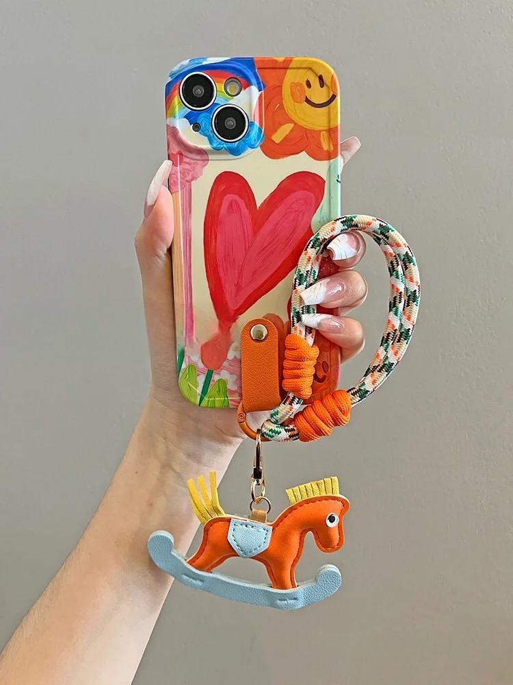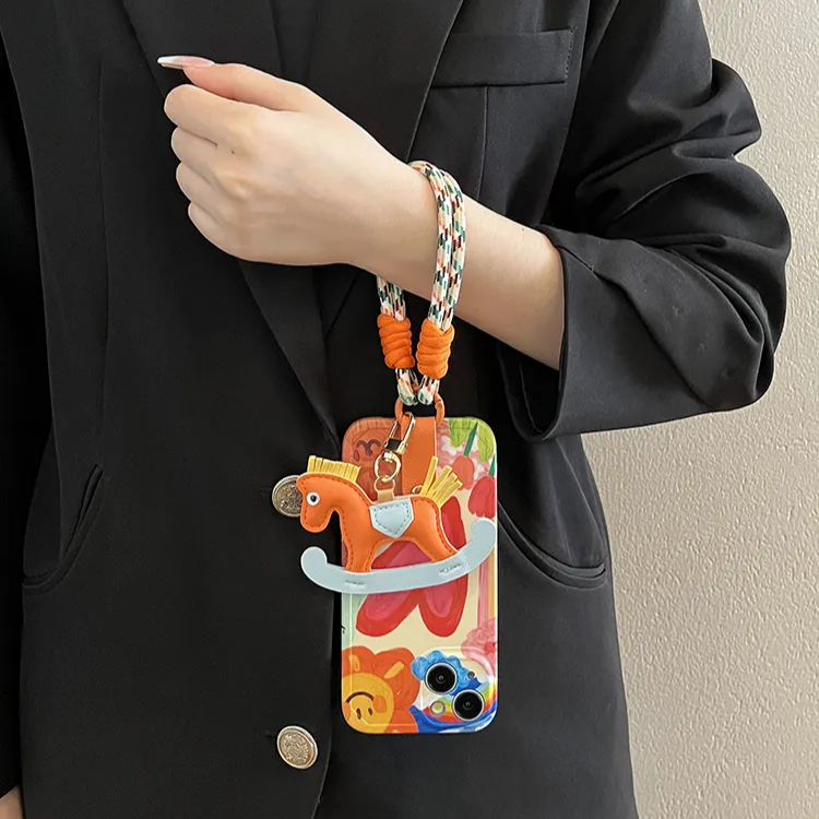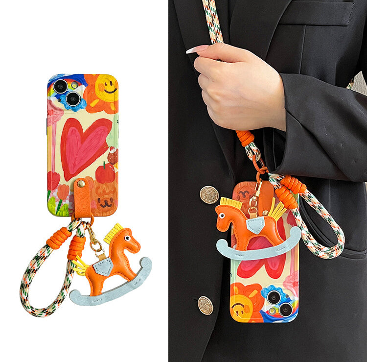 - Includes: Phone case, wrist strap, rocking horse keychain