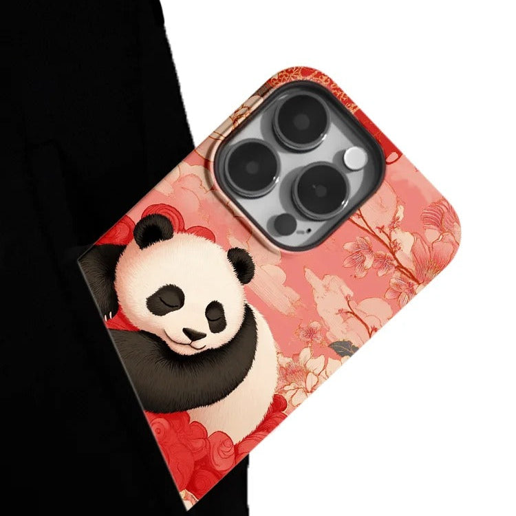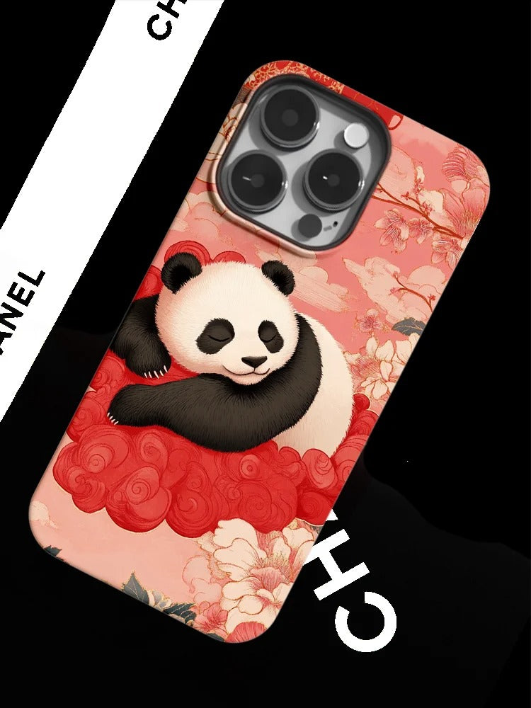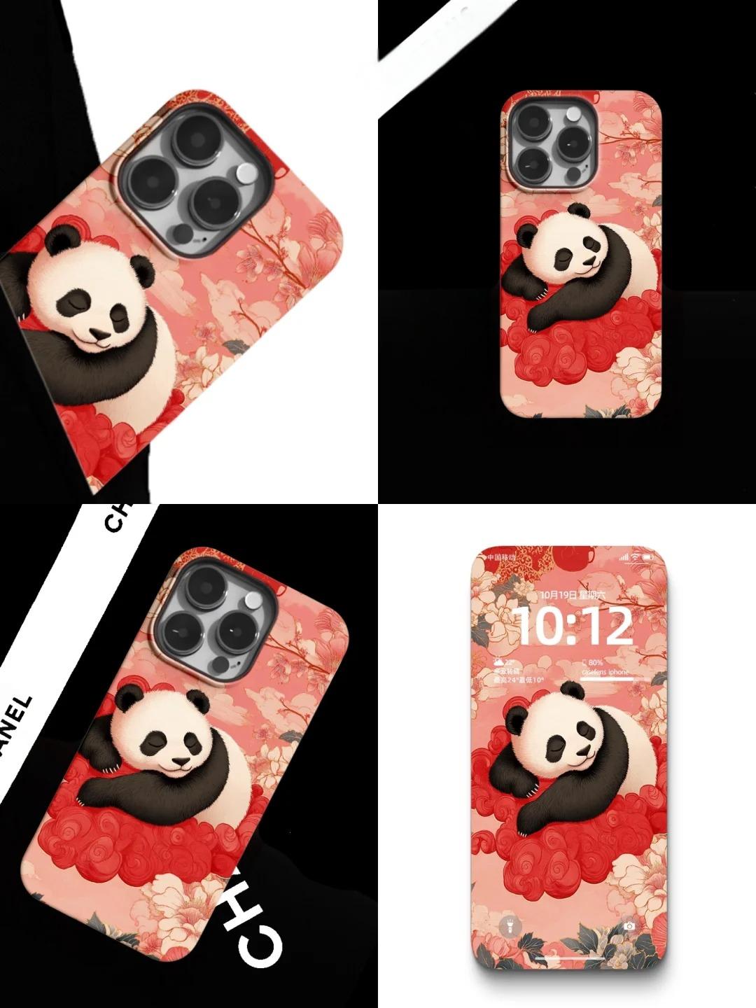 - Features a serene panda lounging on swirling red clouds with a blooming floral backdrop—symbolizing peace, fortune, and charm.