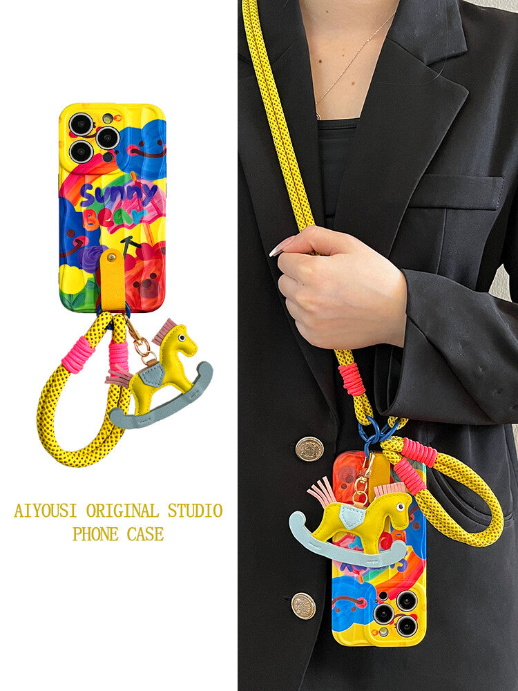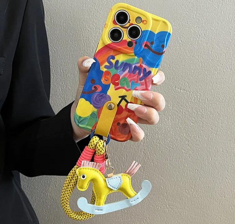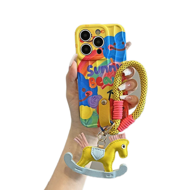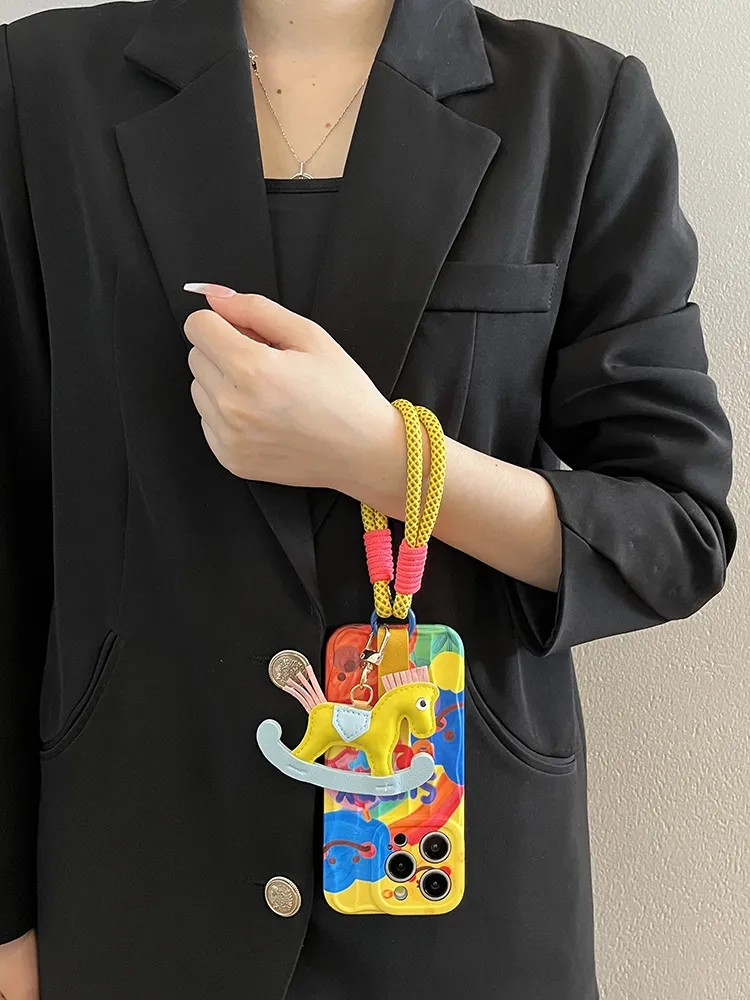 Includes: Phone case, braided wrist strap, rocking horse keychain